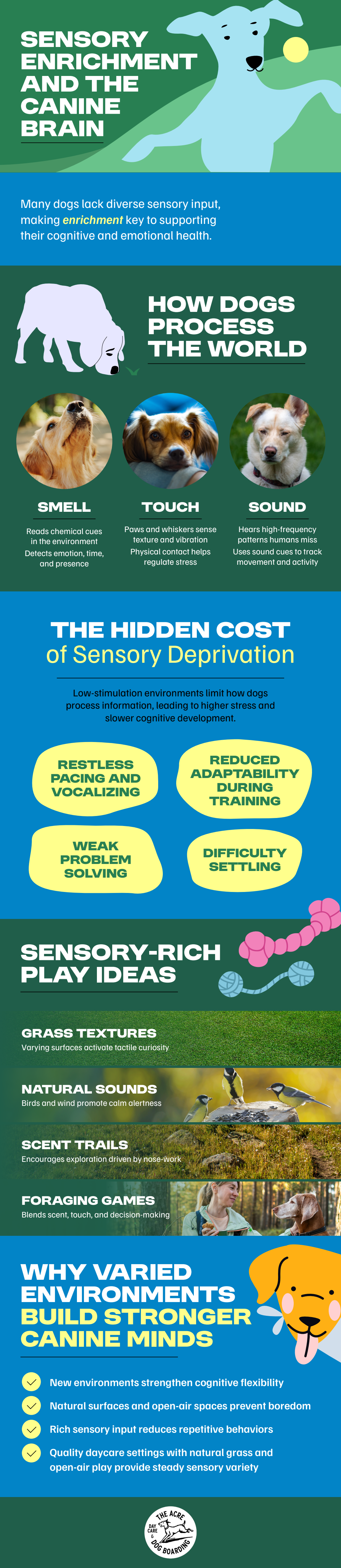 Supporting the canine brain through sensory enrichment improves behavior, resilience, and overall well-being. Dogs that regularly engage their senses are often calmer, more confident, and better prepared for change. Enrichment does not require complex tools or long sessions, only intention and consistency. By offering varied sensory experiences, owners help dogs thrive mentally and emotionally throughout every stage of life. Check out the infographic below to learn more.