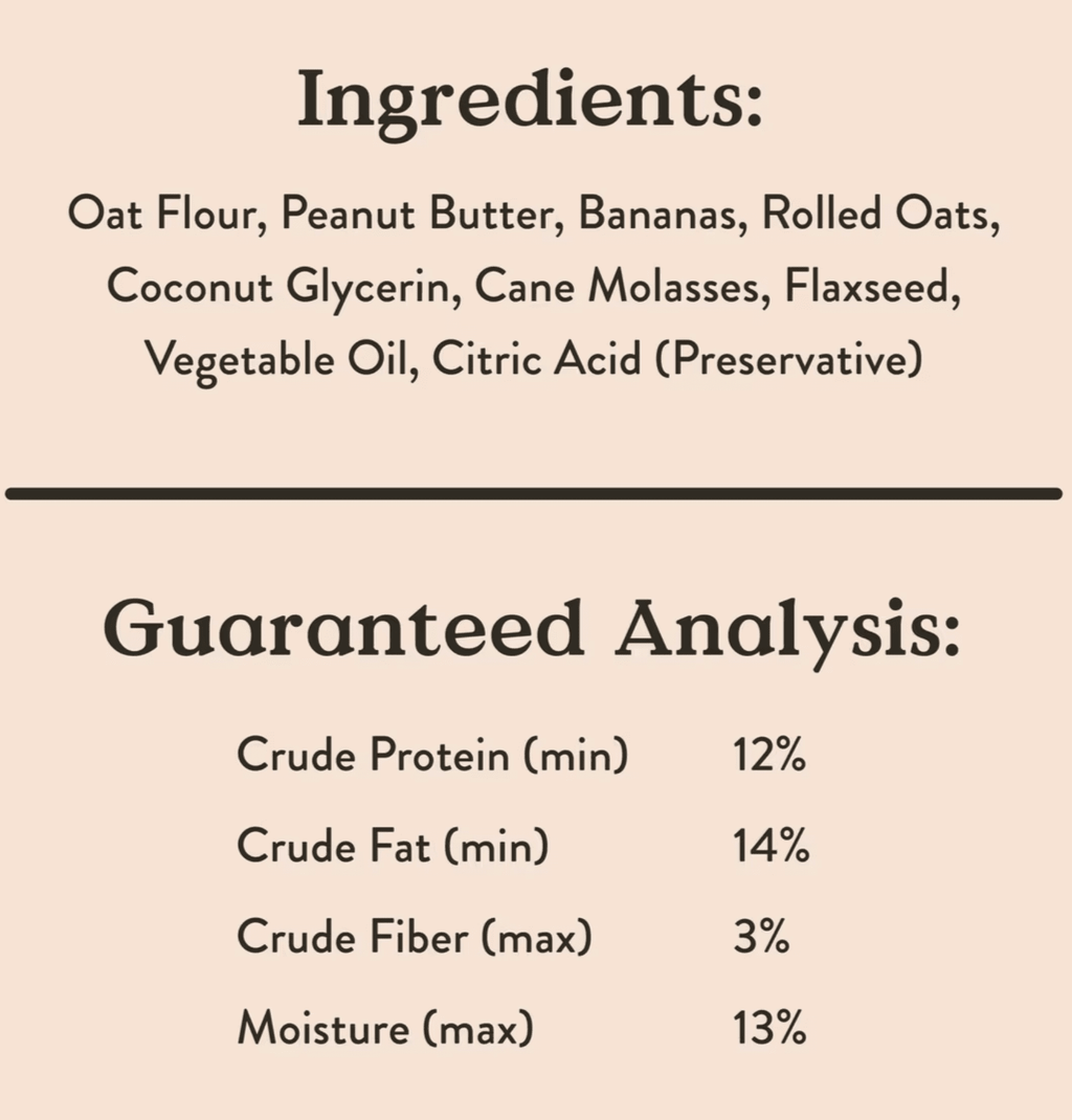 Ingredients: Oat Flour, Peanut Butter, Bananas, Rolled Oats, Coconut Glycerin, Molasses, Flaxseed, Vegetable Oil, Citric Acid