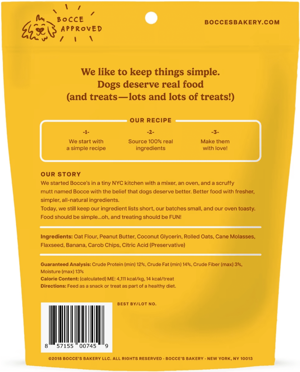 About Bocce' Bakery: We started Bocce’s in a tiny West Village kitchen with a mixer, an oven, and a scruffy mutt named Bocce with the belief that dogs deserve better. Better food with fresher, simpler, all-natural ingredients.