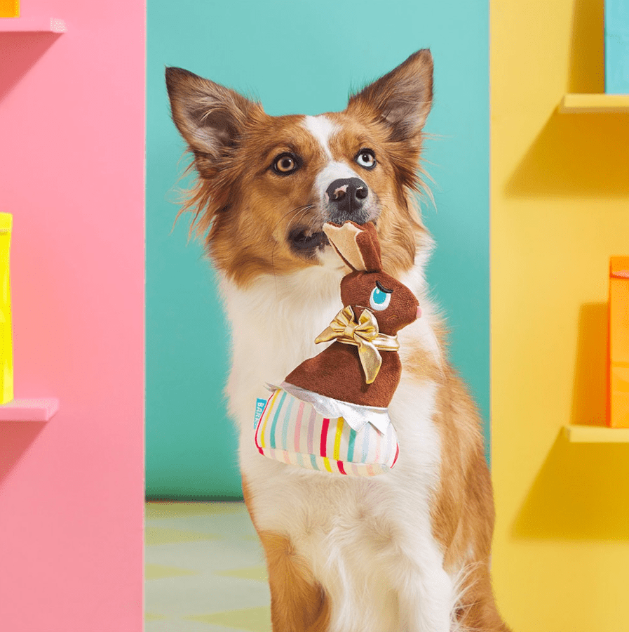 The BARK Lil Bunny Chew Chew Dog Toy will hop into your heart! This "chocolate" bunny dog toy is ready to unwrap some fun! Made with crazy crinkle and a squeaker, Lil' Bunny Chew Chew is packed with fluff, and his whip-n-flip ears are great for dogs who like to thrash when they play. Finally, some chocolate your pup can enjoy! (Whether Lil’ Bunny Chew Chew is hoppy about it or not.)