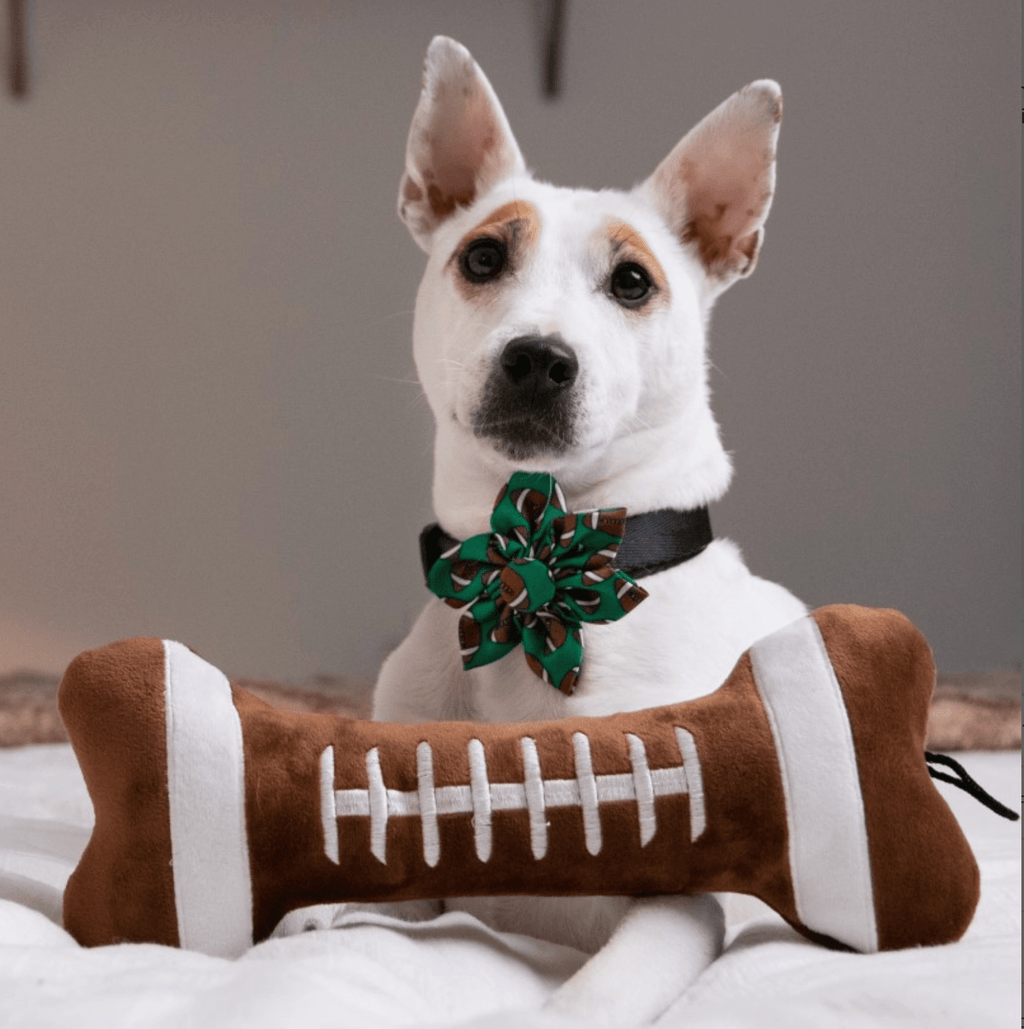 Capture the joy of football season in a soft yet durable bone dog toy for your best game-watching bud!