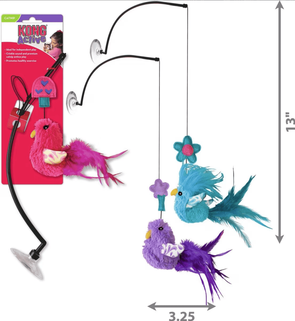 The Window Teaser Cat Toy includes KONG Premium North American Catnip, bright feathers and a crinkle sound for added stimulation.