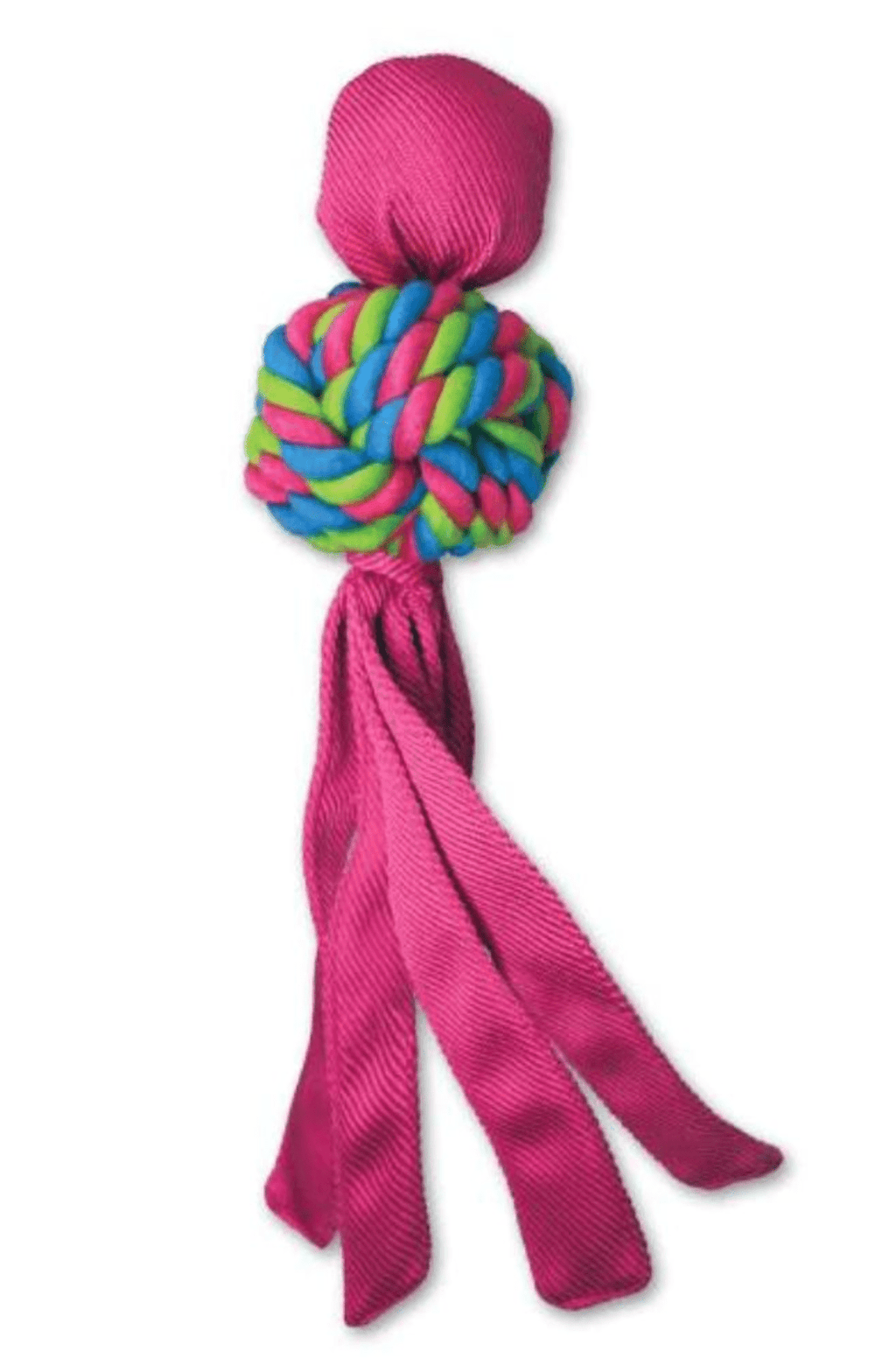 - Made with durable, ballistic nylon for added toughness, a squeaky ball on one end and tails on the other for extra shaking fun