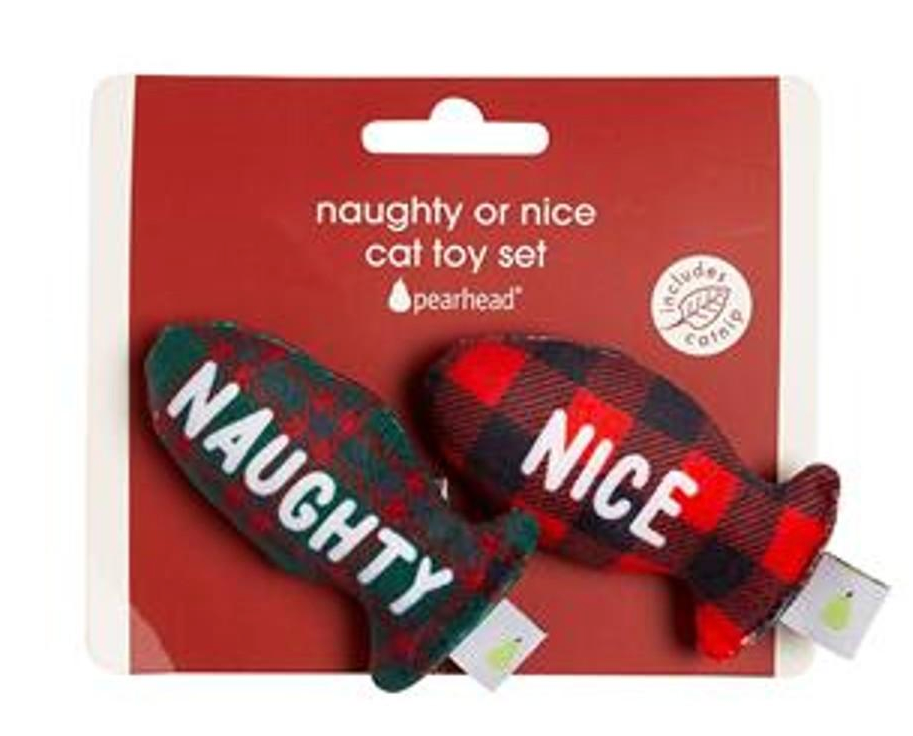 Playtime with your furry friend has never been so adorable! This naughty or nice holiday pet toy set by Pearhead is sure to quickly become a favorite go-to for pet owners and their fun-loving cats and kittens! This pet play accessory set includes two cat toys: one crinkle fish toy with bold, white “naughty” print and one rattle fish toy with bold, white “nice” print – each toy includes a cat nip pouch!